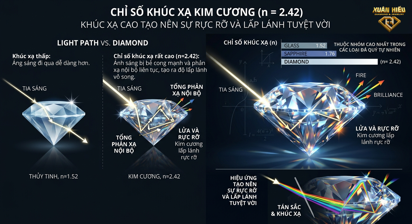 Đối với kim cương, khi ánh sáng đi từ không khí vào viên đá, nó sẽ bị bẻ cong và phản xạ nhiều lần bên trong, tạo nên hiệu ứng ánh sáng đặc trưng.