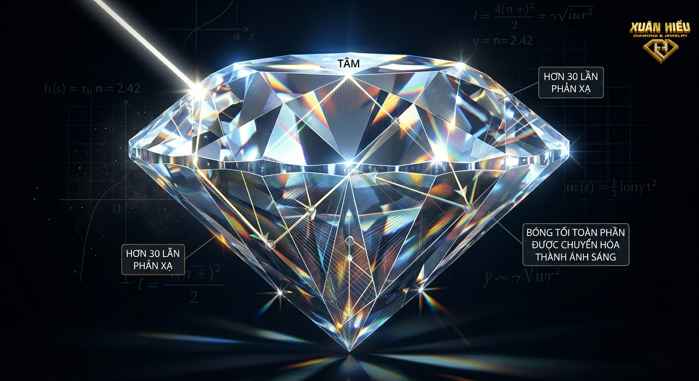 Ánh sáng đi vào kim cương sẽ bị phản xạ lại từ các mặt cắt bên trong, tạo nên độ sáng.