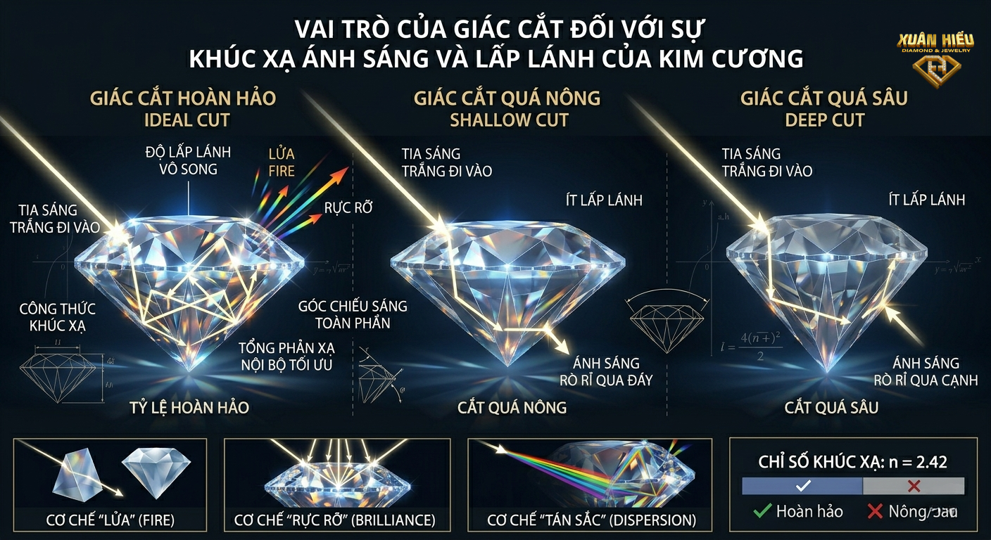 👉 Vì vậy, giác cắt là yếu tố quyết định cách ánh sáng “hoạt động” bên trong kim cương.