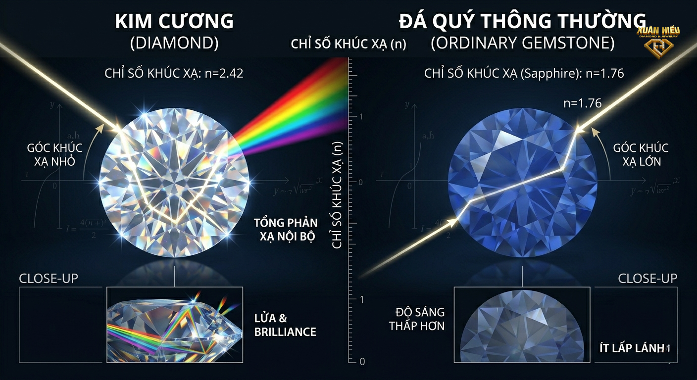 Kim cương có chỉ số khúc xạ rất cao, khoảng 2.42 – thuộc nhóm cao nhất trong các loại đá quý tự nhiên.
