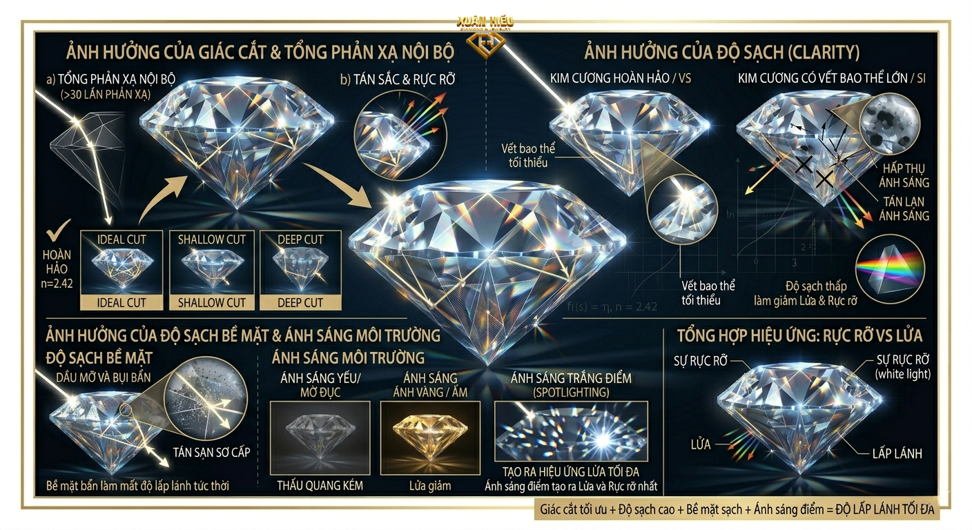 Ngoài khúc xạ, độ lấp lánh còn phụ thuộc vào: