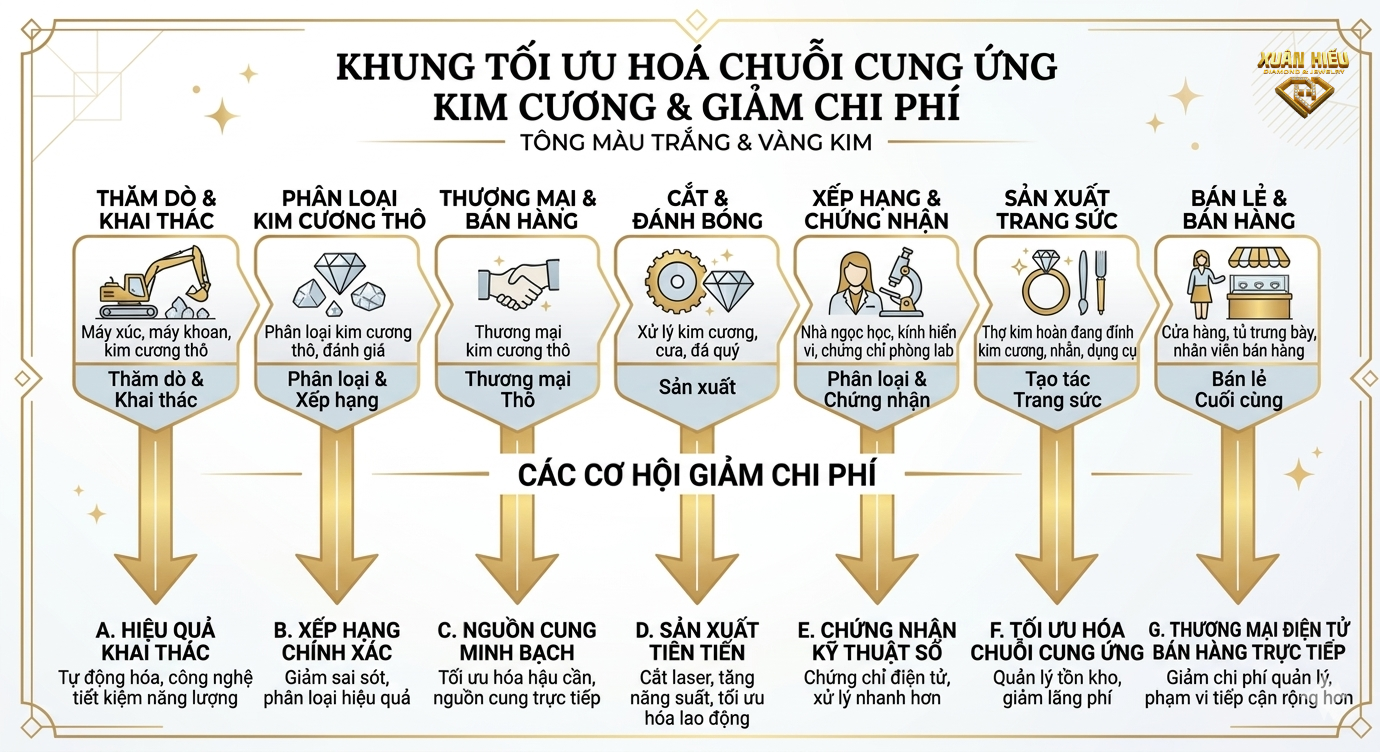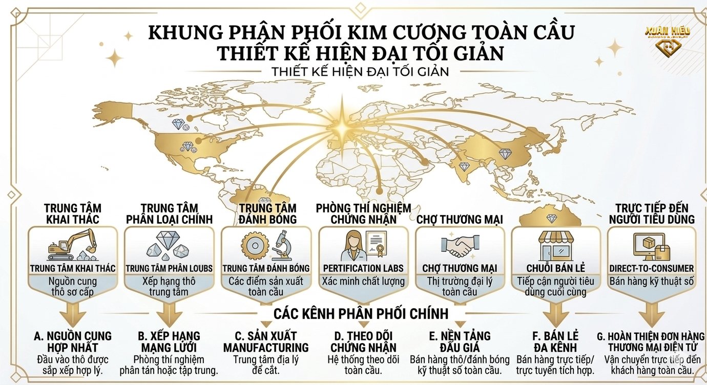 Kim cương là một trong những ngành công nghiệp có chuỗi cung ứng toàn cầu phức tạp, bao gồm nhiều công đoạn như khai thác – cắt mài – phân phối – bán lẻ.